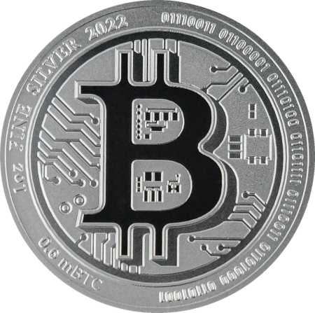 Awers monety przedstawia słynne logo Bitcoina oraz oznaczenie 1.3 mBTC (millibitcoins) – symboliczny przelicznik odzwierciedlający wartość 1 uncji srebra w momencie projektowania. Widoczne są również napisy: Fine Silver, 1 oz oraz rok emisji 2022. Krawędź monety zdobi wyjątkowy kod binarny, który kryje imię legendarnego twórcy Bitcoina – Satoshi Nakamoto.