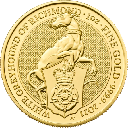Biały chart z Greyhound symbolizuje lojalność, odwagę i siłę, a jego wizerunek odnosi się do rodu Henryka VII. Moneta jest częścią prestiżowej serii Queen’s Beasts, w której każda emisja przedstawia jedno z dziesięciu legendarnych stworzeń związanych z historią brytyjskiej monarchii.