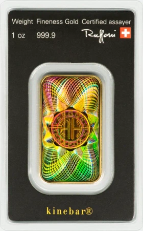 Kinebar® to opatentowana technologia zabezpieczenia sztabek, opracowana przez Argor-Heraeus wspólnie z bankiem UBS. Na rewersie znajduje się specjalny holograficzny wzór Kinegram®, który zmienia kolor i efekt wizualny w zależności od kąta patrzenia — dzięki temu sztabka: