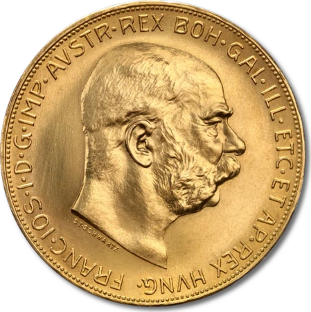 Mennica Austriacka rozpoczęła bicie złotych koron w 1892 r., kiedy to Franciszek Józef I zlecił reformę walutową. Pierwsze monety miały nominały 10 koron i 20 koron. Większa 100 koron nastąpiła w 1908 roku dla upamiętnienia diamentowego jubileuszu cesarza. Mennica Austriacka zaprzestała produkcji złotych monet kruszcowych po wybuchu I wojny światowej, a kiedy w 1921 r. ponownie rozpoczęto bicie, podjęto decyzję o tym, że monety z 1915 r. będą upamiętniać ostatni pełny rok panowania króla. Przez ponad pięćdziesiąt lat, 100 austriackich koron było jedyną z szeroko rozpowszechnionych złotych monet na rynku kruszców, ale moneta została wyparta przez południowoafrykańskiego Krugerranda, który został stworzony specjalnie z myślą o rynku indywidualnych inwestorów.