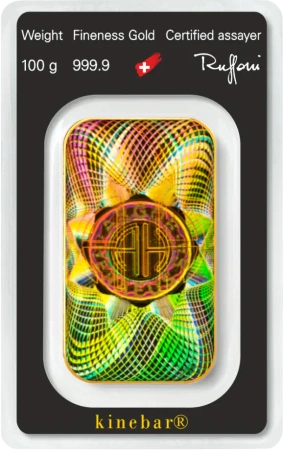 Sztabka Kinebar od Argor-Heraeus wyróżnia się specjalnym hologramem zabezpieczającym na rewersie, który nie tylko potwierdza autentyczność, ale także nadaje jej unikalny wygląd.