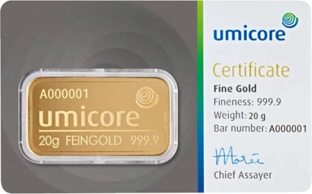 Specyfikacja 20g Gold Bar | Umicore: