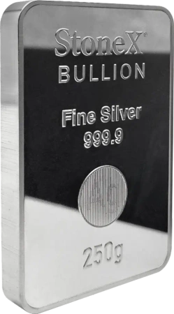 Awers przedstawia logo StoneX Bullion, oznaczenie wagi, rodzaju metalu i czystości – „SILVER 999 • 250 g”.