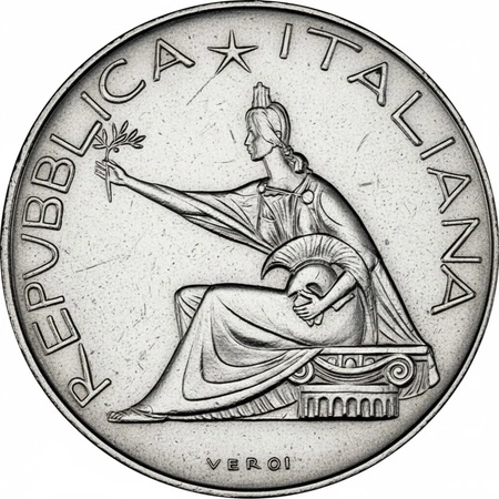 Na awersie monety znajduje się:profilowa głowa kobiety symbolizującej Italię (Italia Turrita), zwrócona w prawo napis „REPUBBLICA ITALIANA” nazwisko projektanta „GIAMPAOLI” Awers odzwierciedla powojenną tożsamość Włoch oraz republikańskie wartości państwa, łącząc klasyczną estetykę z nowoczesnym stylem artystycznym.