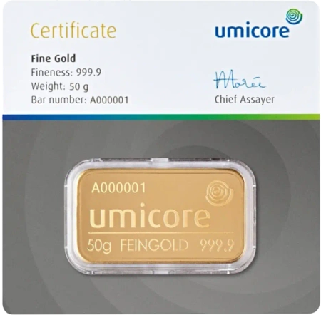 50g Gold Bar | Umicore to precyzyjnie wykonana sztabka złota, która łączy najwyższą jakość, bezpieczeństwo i uznaną renomę producenta. Wykonana ze złota próby 999.9/1000, pochodzi z belgijskiej rafinerii Umicore, akredytowanej przez London Bullion Market Association (LBMA). Dzięki temu każda sztabka posiada pełną gwarancję autentyczności i jest powszechnie akceptowana na rynkach metali szlachetnych na całym świecie.