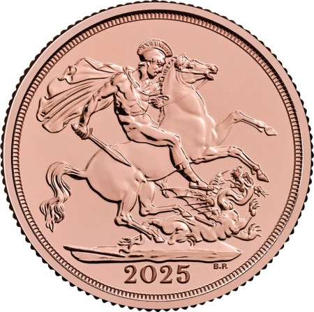 Na awersie monety znajduje się oficjalny wizerunek króla Karola III, autorstwa Martina Jenningsa, przedstawiający monarchę w klasycznym, realistycznym stylu. Rewers zdobi ponadczasowy projekt św. Jerzego walczącego ze smokiem, stworzony przez Benedetta Pistrucciego – symbol odwagi i siły, który od ponad dwóch wieków zdobi złote Suwereny.